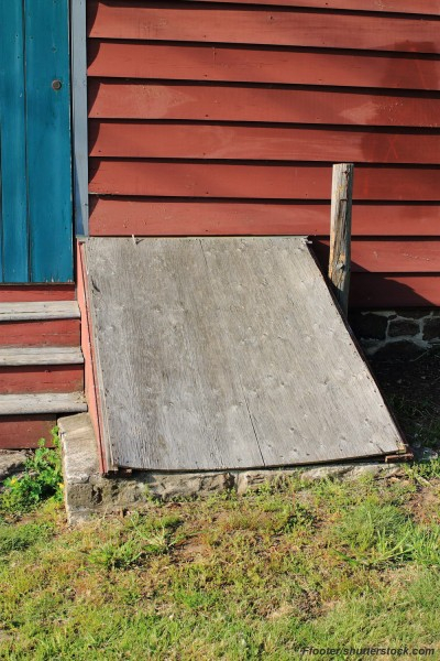 Традиционно делается нечто вроде небольшого домика над входом в погреб. Однако традиция соблюдается в основном в тех случаях, когда он встраивается в какое-либо возвышение. Если участок у вас достаточно ровный, можно поставить обычную дверь (достаточно широкую) под солидным наклоном и постараться придумать, как защитить её (а заодно и сам погреб) от осадков. Советуем не полениться и всё-таки построить «домик» у входа. Сооружение это достаточно условное и не требует особых навыков или затрат, но вот погреб станет защищён заметно лучше, да и с дизайном строения можно придумать немало интересного.